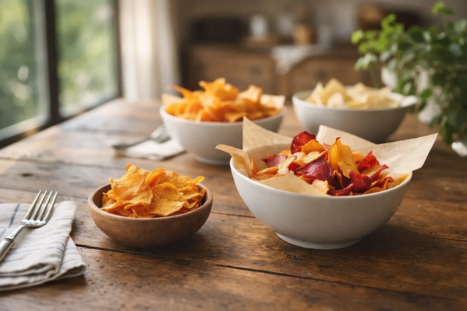 Se le prepari per un aperitivo o una cena, il contesto cambia. Diverse varietà di chips colorate disposte su un vassoio creano un effetto visivo interessante. L'abbinamento con salse e dip è fondamentale per trasformare uno snack in un'esperienza.